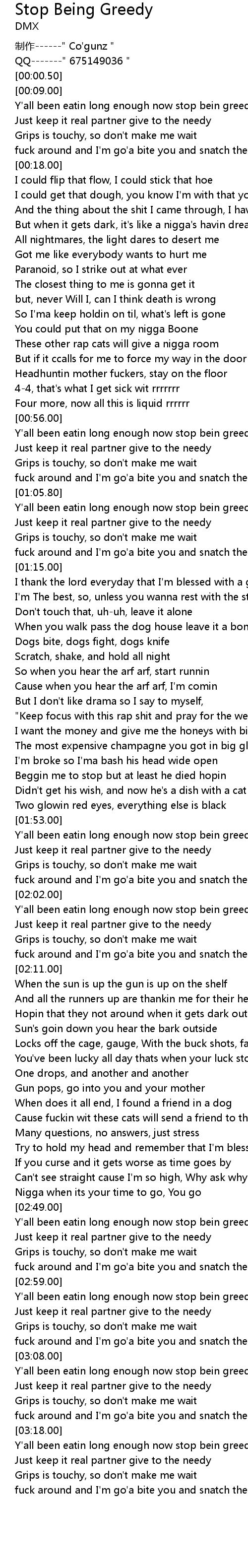 | [03:18.63] | Y'all been eatin long enough now stop bein greedy |
