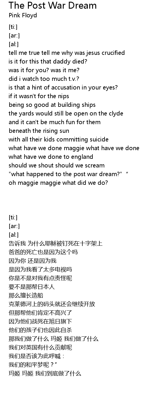 | [02:22.90] | "what happened to the post war dream?"“ |