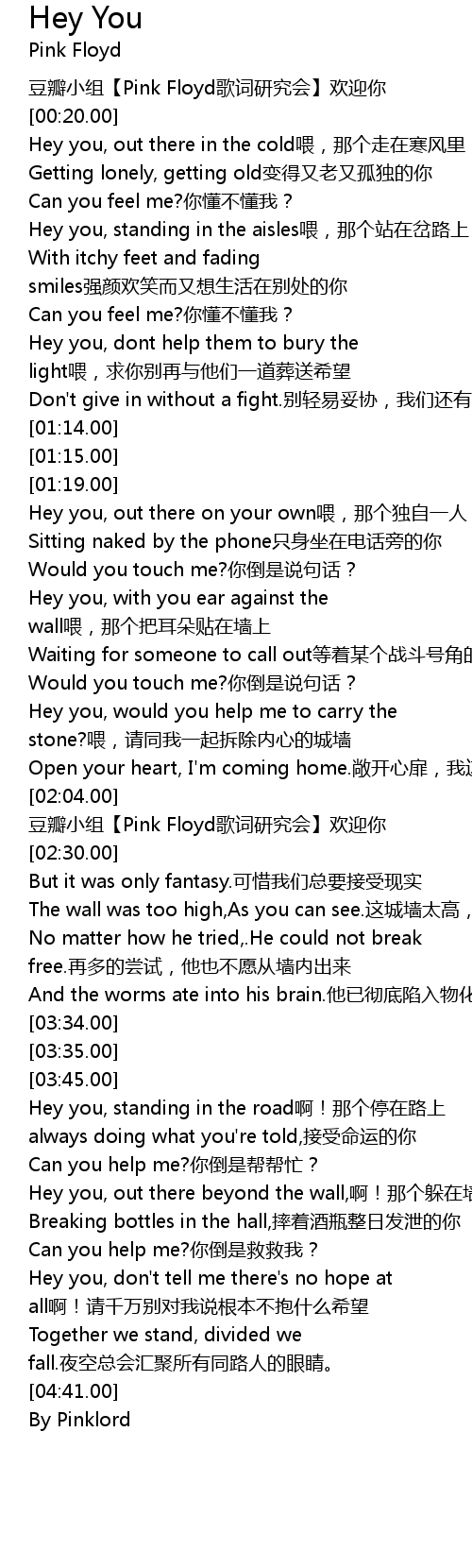| [04:07.00] | Hey you, out there beyond the wall,啊!那个躲在墙后 |