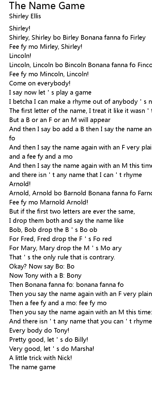 | Shirley, Shirley bo Birley Bonana fanna fo Firley | |