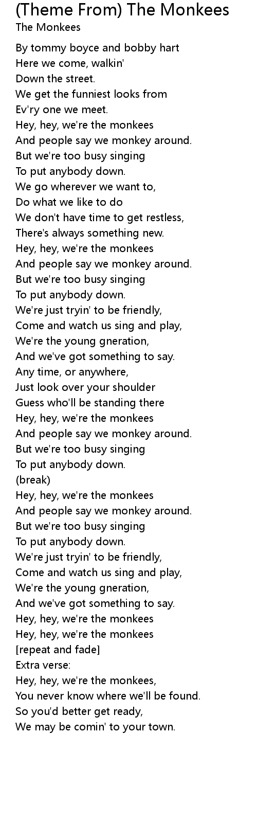 Hey, hey, we're the monkees, |