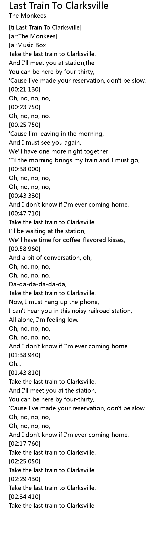 [02:31.110] Take the last train to Clarksville,