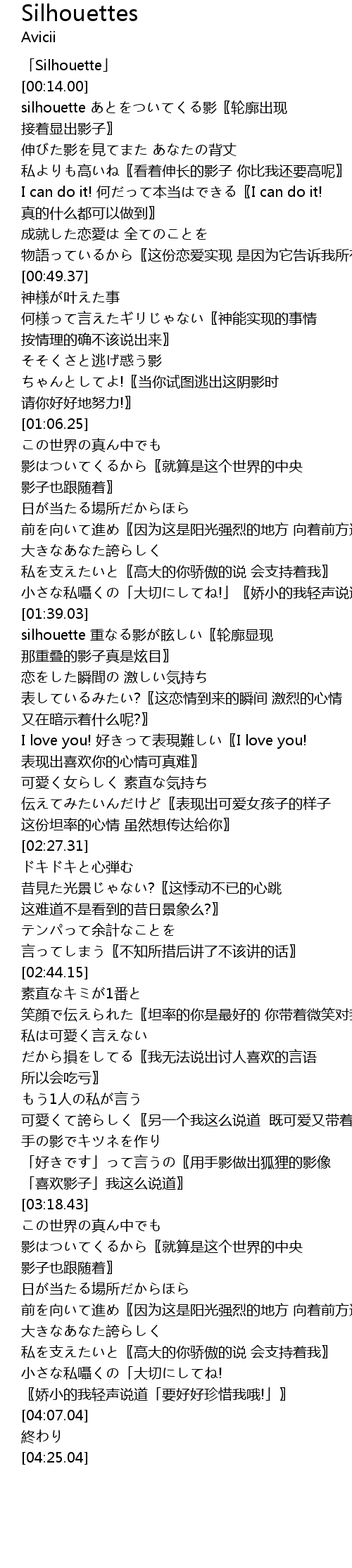 | [00:17.76] | silhouette あとをついてくる影〖轮廓出现 接着显出影子〗 |
