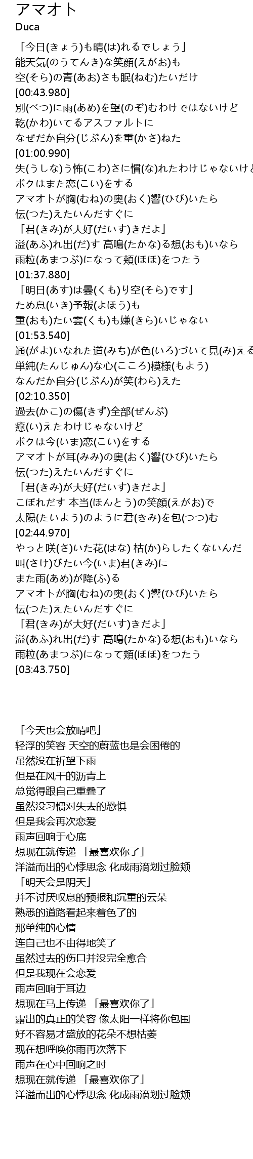 | [02:22.210] | アマオトが耳(みみ)の奥(おく)響(ひび)いたら |