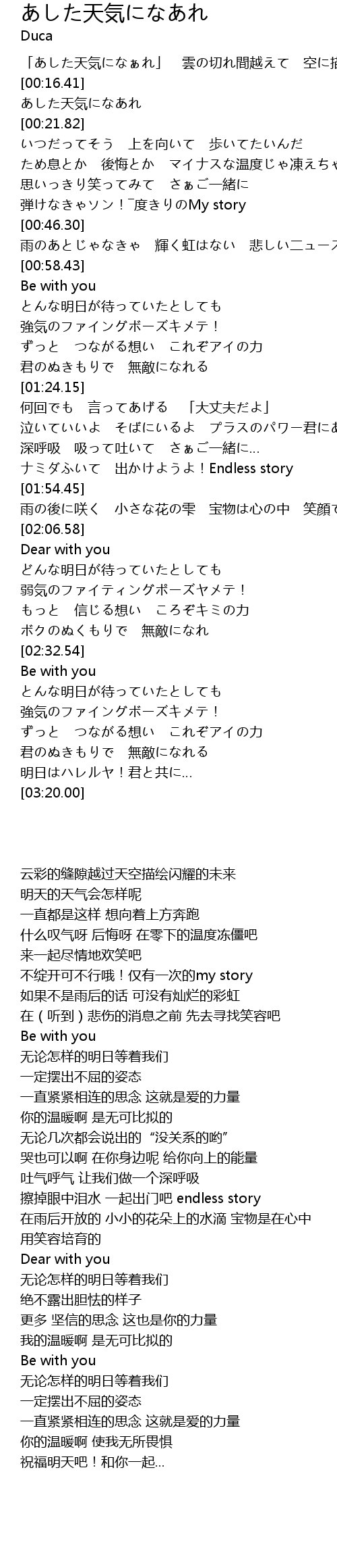 | [00:01.92] | 「あした天気になぁれ」 雲の切れ間越えて 空に描くんだ 煌く未来 |