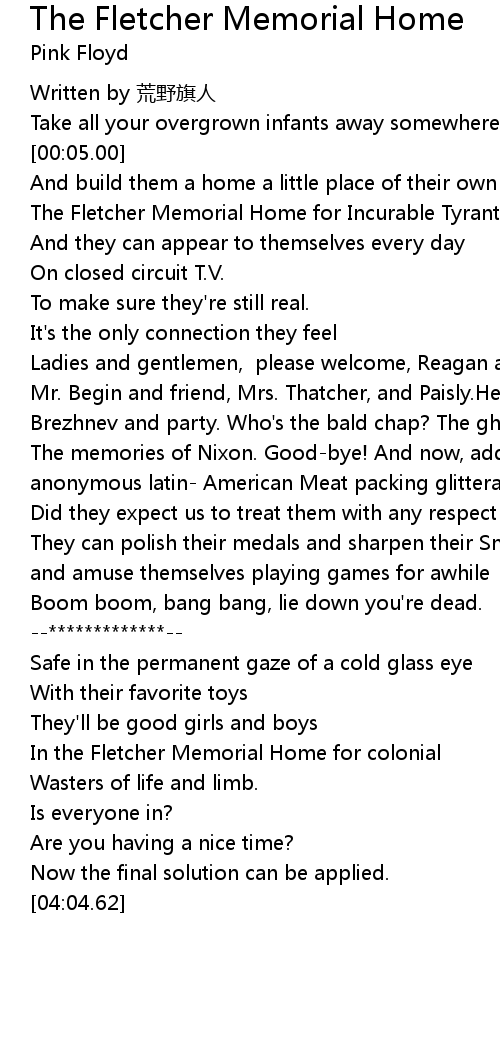 | [00:24.67] | The Fletcher Memorial Home for Incurable Tyrants and Kings. |