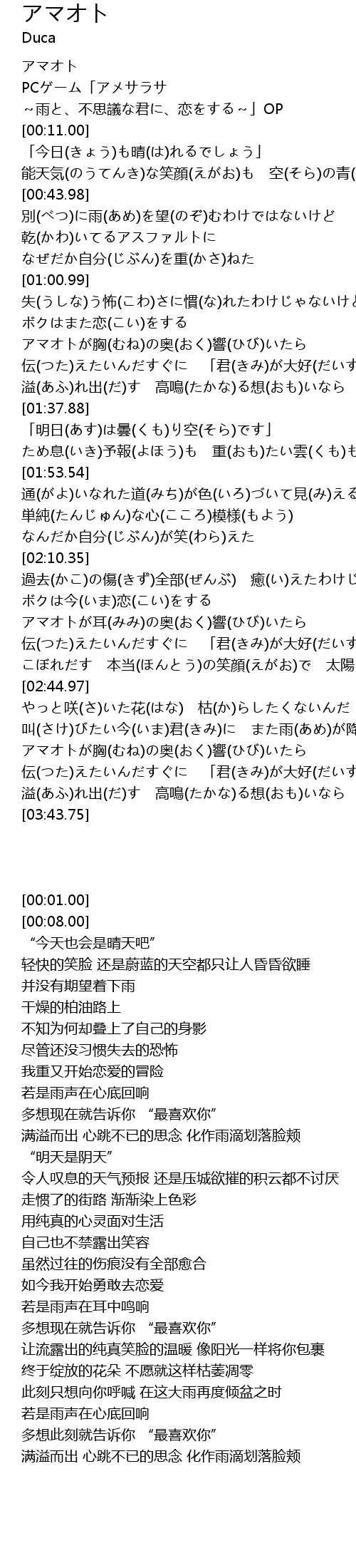 | [00:08.00] | PCゲーム「アメサラサ ~雨と、不思議な君に、恋をする~」OP |