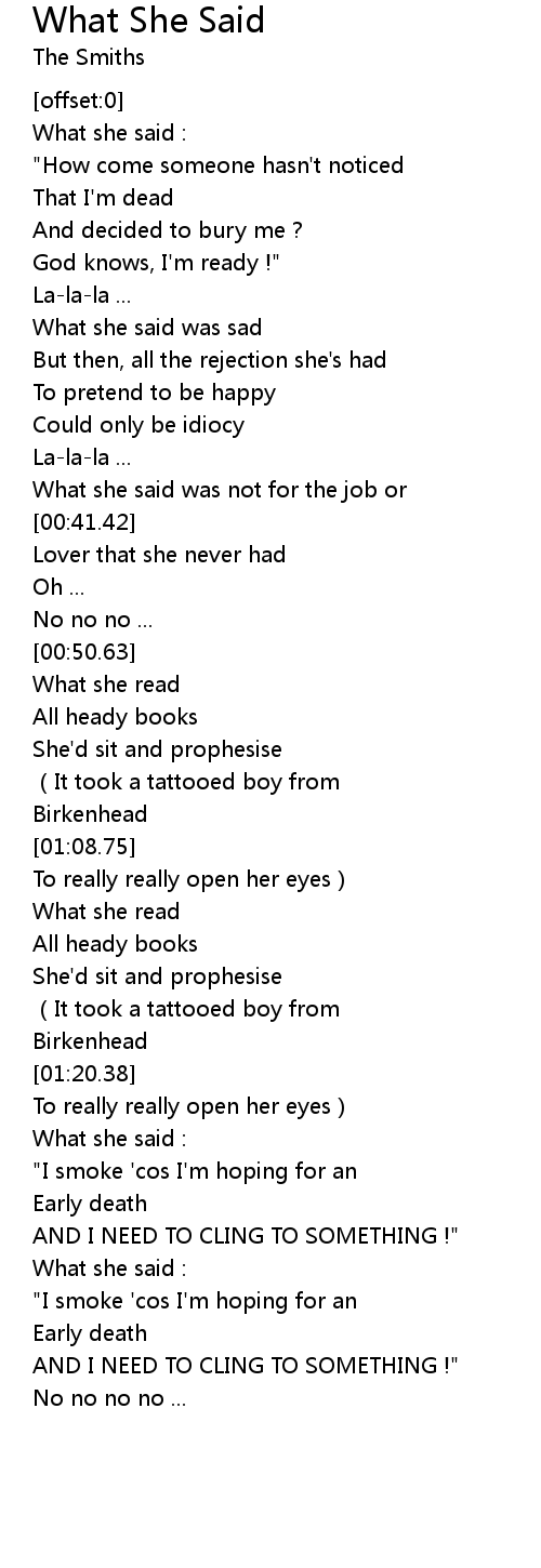 | [01:36.90] | "I smoke 'cos I'm hoping for an |