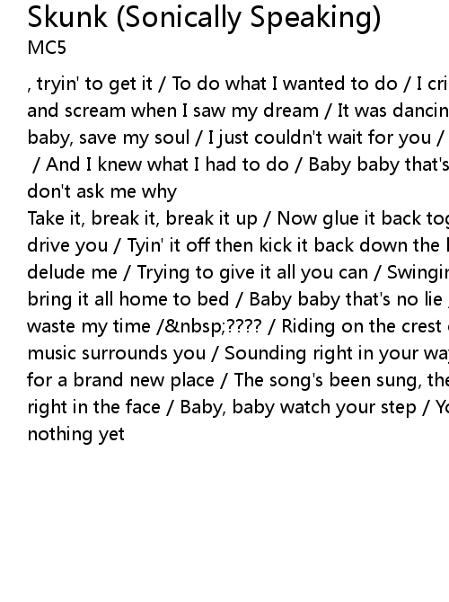 Take it, break it, break it up / Now glue it back together again / I'm tryin' to drive you / Tyin' it off then kick it back down the bend / ???? / Tryin' to delude me / Trying to give it all you can / Swingin' squealin' brushin' up / Now bring it all home to bed / Baby baby that's no lie / Sit on my face when you waste my time / ???? / Riding on the crest of a wave / How appallin', the music surrounds you / Sounding right in your way / Oh baby, off we go / Headin' for a brand new place / The song's been sung, the deed's been done / Staring you right in the face / Baby, baby watch your step / You know you really ain't seen nothing yet |