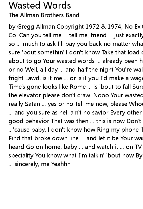 by Gregg Allman Copyright 1972 & 1974, No Exit Music Co., Inc. & Allbros Music Co. Can you tell me ... tell me, friend ... just exactly where I've been Is that so ... much to ask I'll pay you back no matter what the task You seem really sure 'bout somethin' I don't know Take that load off looks like your chest's about to go Your wasted words ... already been heard Are you really God ... yes or no Well, all day ... and half the night You're walkin' round lookin' such a fright Lawd, is it me ... or is it you I'd make a wager and I'd hope to lose Time's gone looks like Rome ... is 'bout to fall Sure gonna fall Next time take the elevator please don't crawl Nooo Your wasted words ... so absurd Are you really Satan ... yes or no Tell me now, please Whoo-hooo Well, I ain't no saint ... and you sure as hell ain't no savior Every other Christmas I would practice good behavior That was then ... this is now Don't ask me to be Mister Clean ...'cause baby, I don't know how Ring my phone 'bout ten more times we will see Find that broke down line ... and let it be Your wasted words ... will never be heard Go on home, baby ... and watch it ... on TV Weekday ... soap box speciality You know what I'm talkin' 'bout now By the way this song's for you ... sincerely, me Yeahhh |