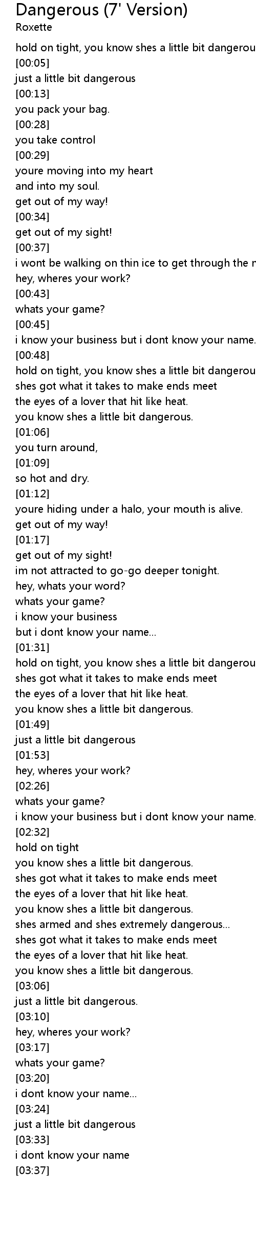 | [00:00] | hold on tight, you know shes a little bit dangerous |