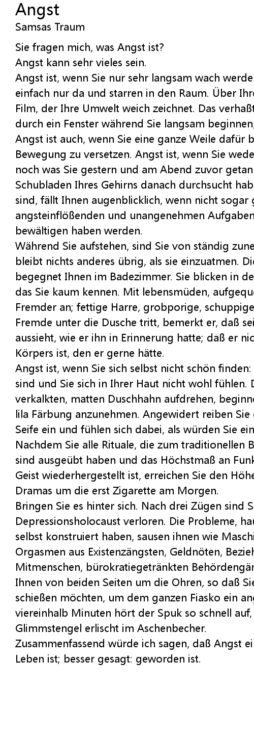 | Zusammenfassend wü rde ich sagen, da Angst ein sehr gro er Bestandteil meines Leben ist besser gesagt: geworden ist. |