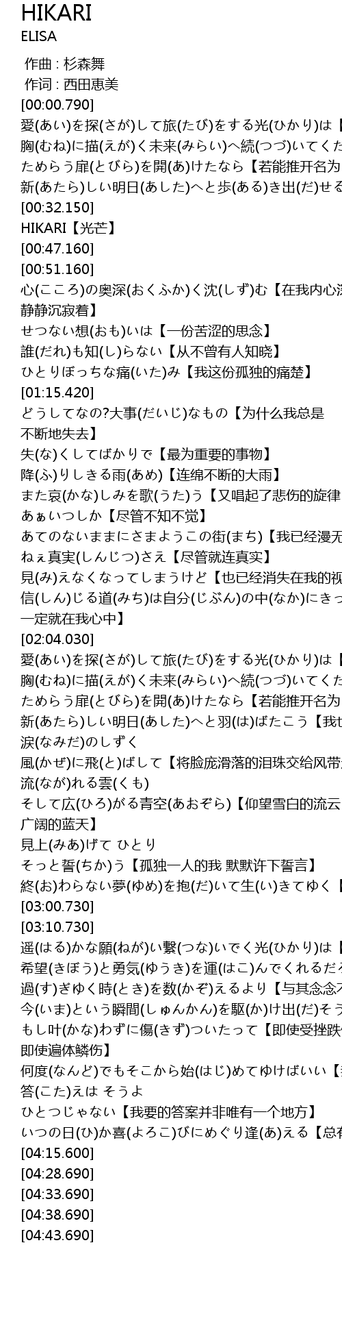 | [02:04.850] | 愛(あい)を探(さが)して旅(たび)をする光(ひかり)は【为寻爱而踏上旅途的那缕光芒】 |
