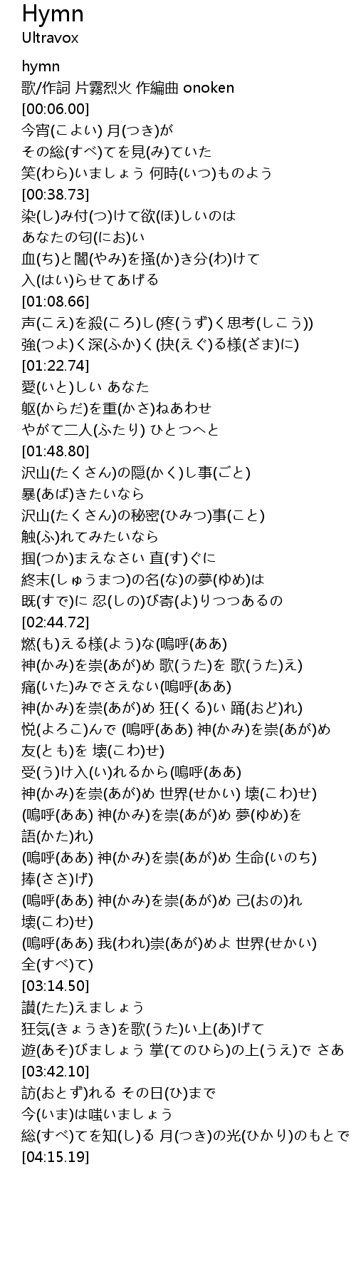 | [03:03.95] | (嗚呼(ああ) 神(かみ)を崇(あが)め 己(おの)れ 壊(こわ)せ) |