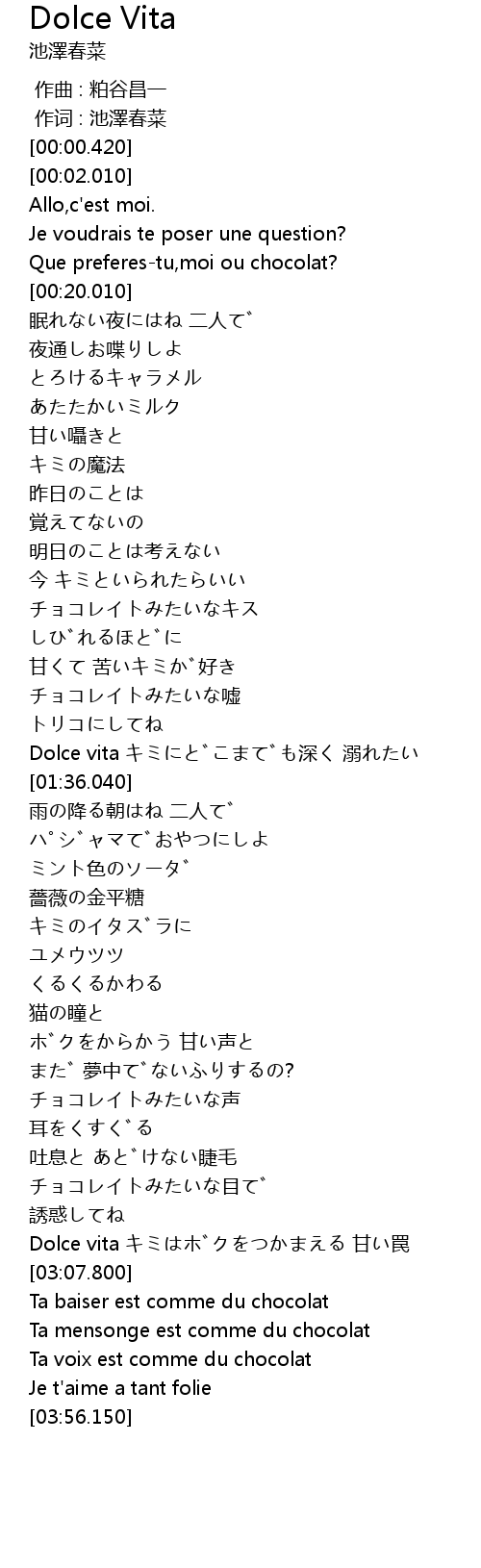 | [01:25.640] | Dolce vita キミにどこまでも深く 溺れたい |