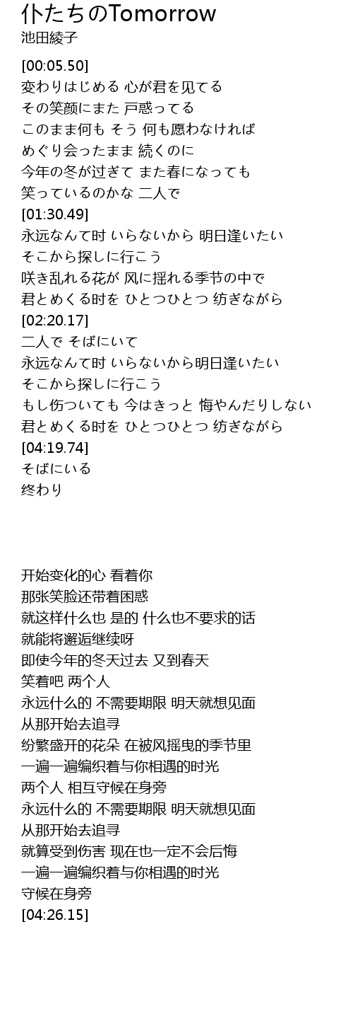 | [01:32.52] | 永远なんて时 いらないから 明日逢いたい |