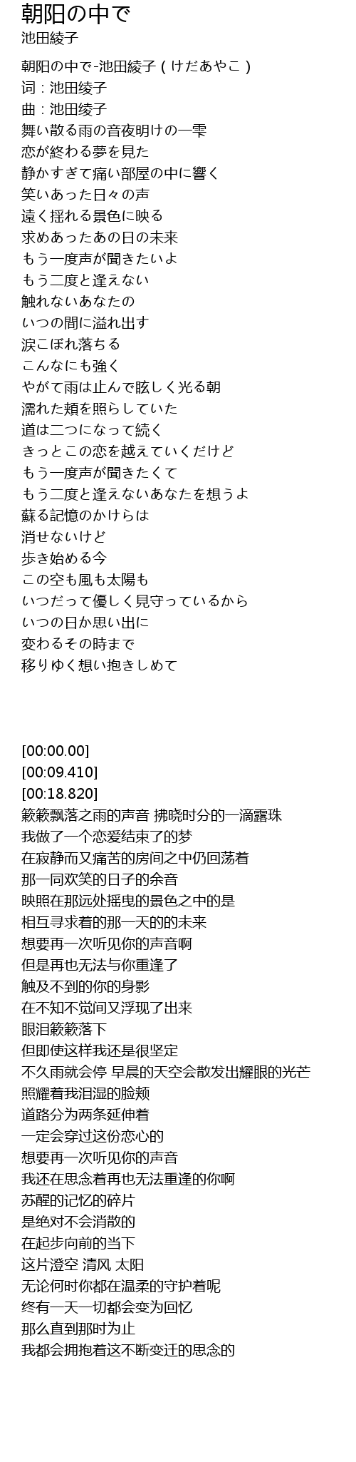 | [00:00.00] | 朝阳の中で-池田綾子(けだあやこ) |