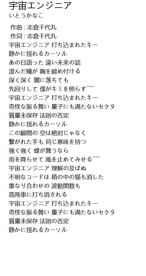 | [00:12.140] | 宇宙エンジニア 打ち込まれたキー |