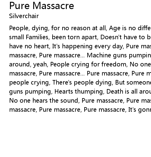 People, dying, for no reason at all, Age is no difference or if you're large or small Families, been torn apart, Doesn't have to be this way, Some people, just have no heart, It's happening every day, Pure massacre, Pure massacre... Pure massacre, Pure massacre... Machine guns pumping, Hearts thumping, Death is all around, yeah, People crying for freedom, No one hears the sound, ohhh, Pure massacre, Pure massacre... Pure massacre, Pure massacre...alright, There's people crying, There's people dying, But someone's taken it all, yeah, Machine guns pumping, Hearts thumping, Death is all around, People crying for freedom, No one hears the sound, Pure massacre, Pure massacre, Pure massacre, Pure massacre, Pure massacre, Pure massacre, It's gonna be, A pure massacre, Yeah |