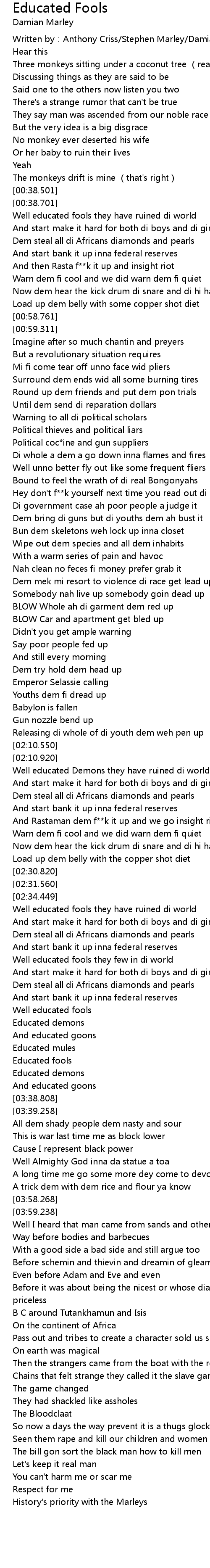 | [00:39.431] | Well educated fools they have ruined di world |
