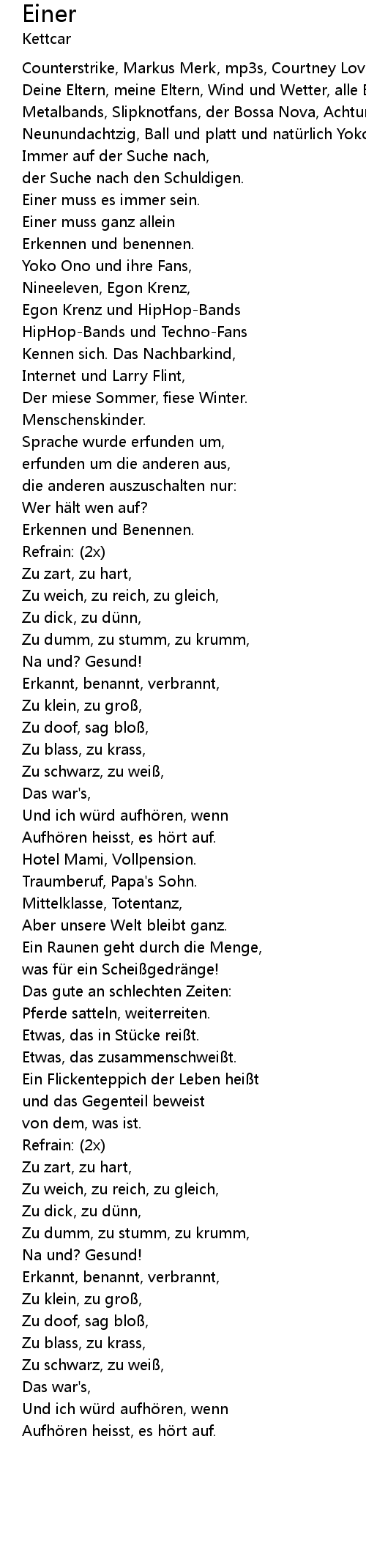 | Zu weich, zu reich, zu gleich, | |