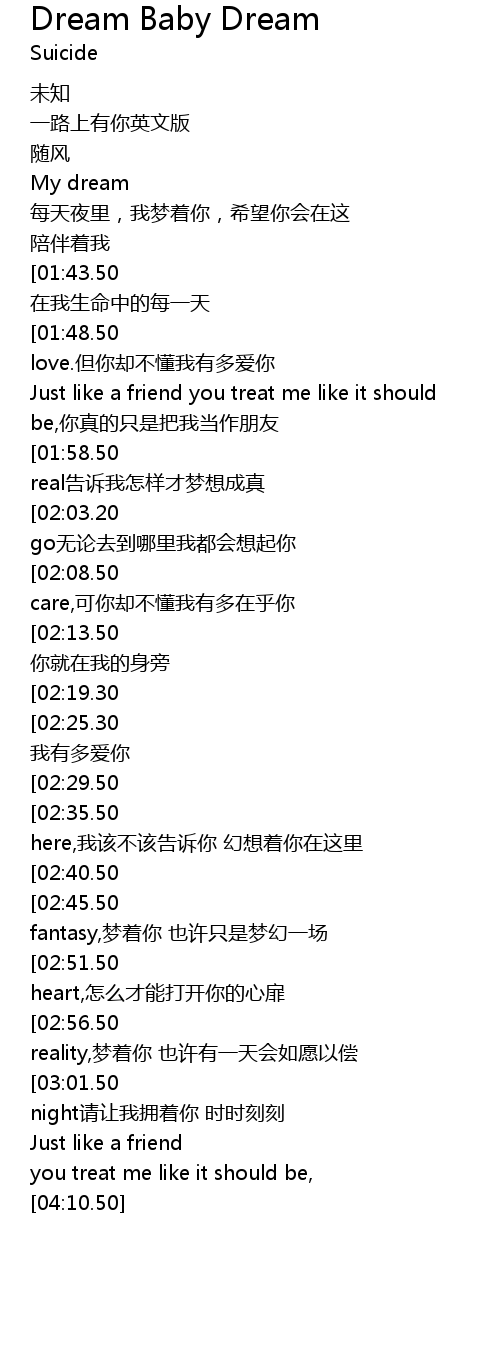 | [01:24.50][02:56.50][03:45.50][04:05.30] | oh am I dreaming, or just reality, mèng zhe nǐ yě xǔ yǒu yì tiān huì rú yuàn yǐ cháng |