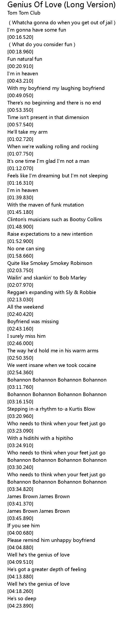 | [04:15.390] | Well he' s the genius of love |