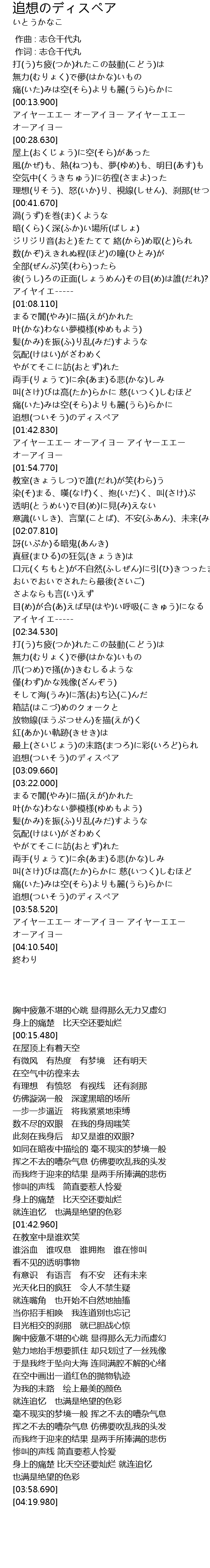 | [03:50.750] | 痛(いた)みは空(そら)よりも麗(うら)らかに 追想(ついそう)のディスペア |