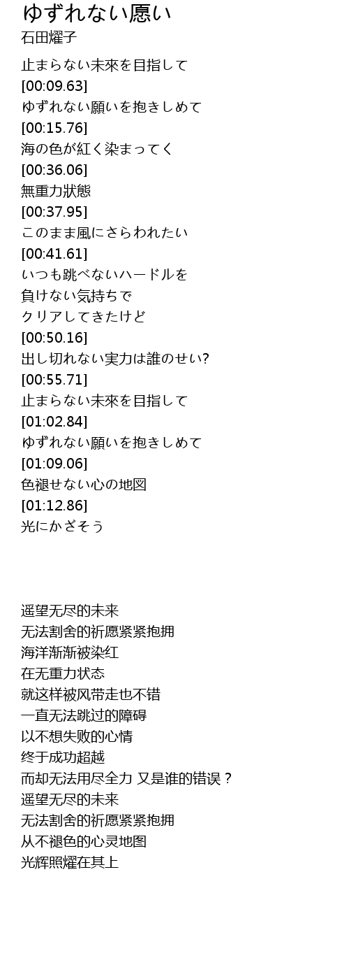 | [01:04.27] | ゆずれない願いを抱きしめて |