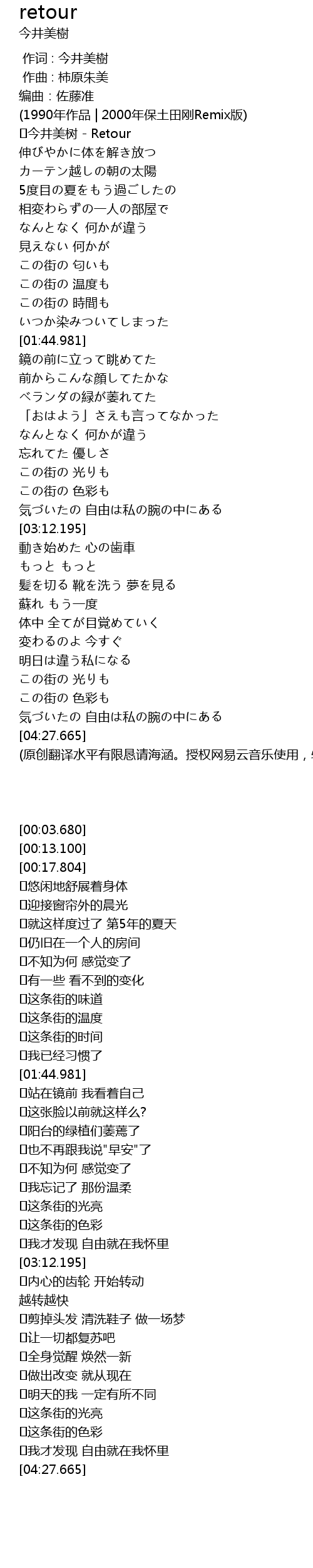 | [00:13.100] | (1990年作品 | 2000年保土田刚Remix版) |