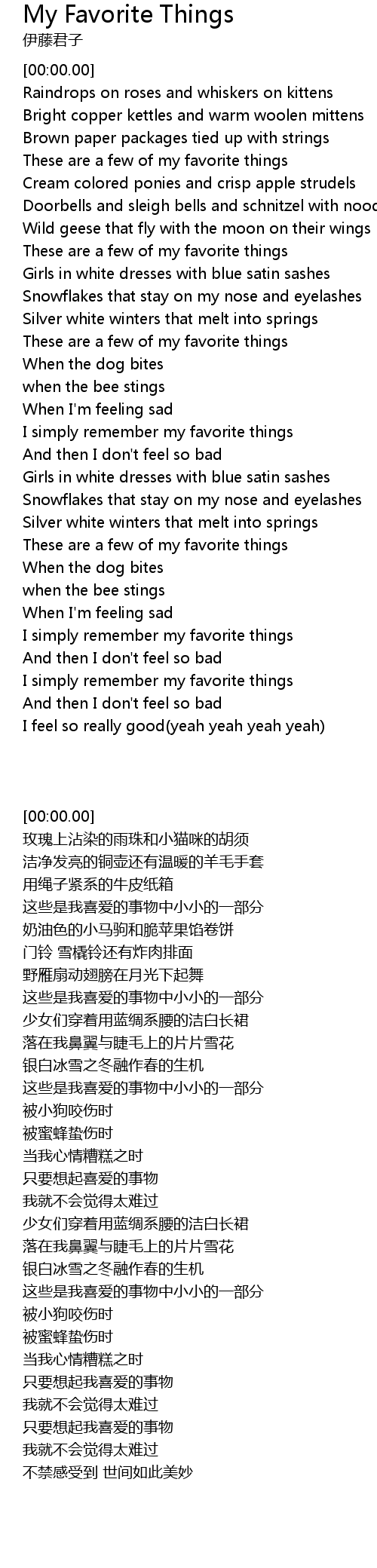 | [00:16.60] | Raindrops on roses and whiskers on kittens |
