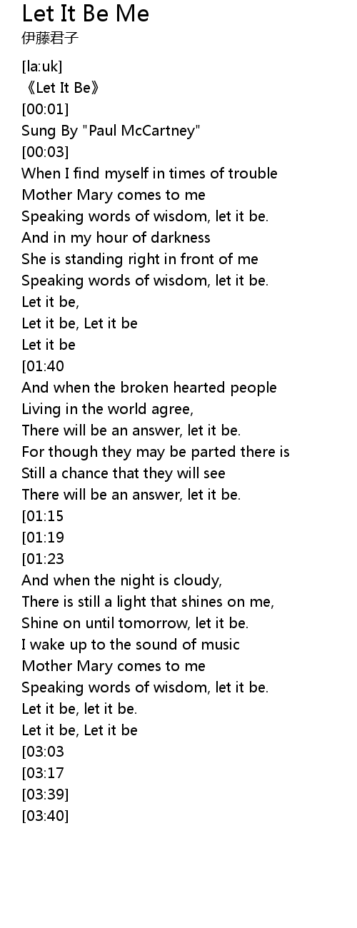| [02:26][01:40][00:40] | Whisper words of wisdom, let it be. |