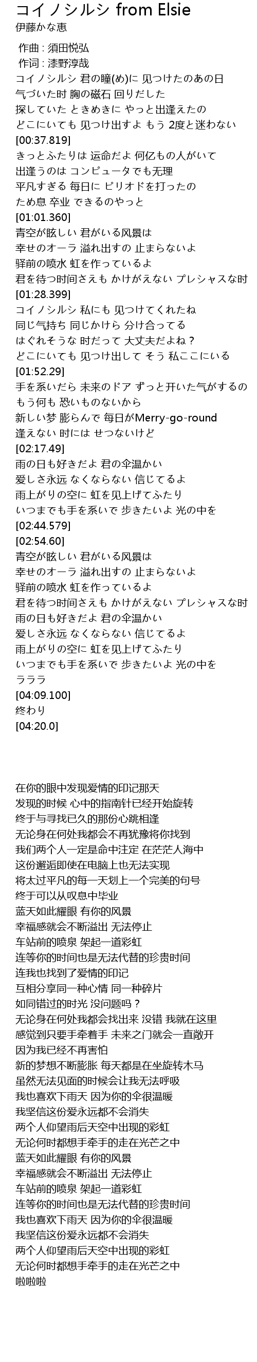 | [00:14.409] | コイノシルシ 君の瞳(め)に 见つけたのあの日 |