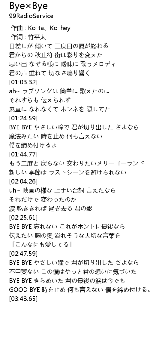 | [03:23.78] | BYE BYE きらめいた 君の最後の涙は今でも |