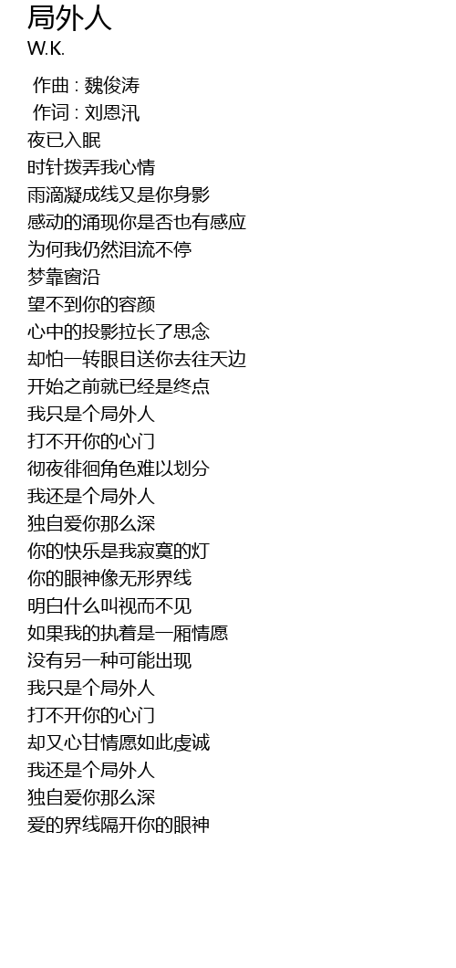 | [02:36.430] | wǒ zhǐ shì gè jú wài rén |