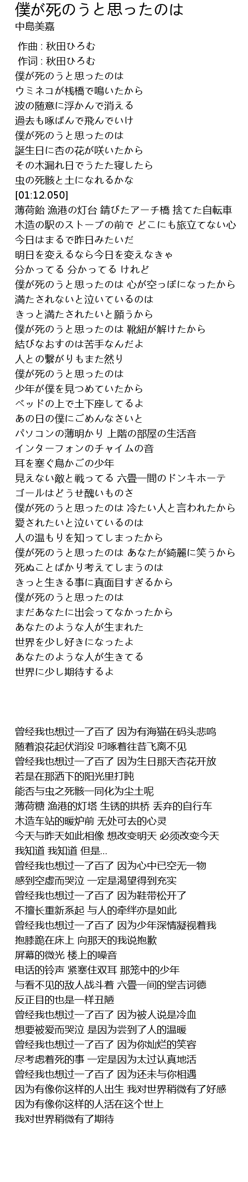 | [04:46.600] | 僕が死のうと思ったのは まだあなたに出会ってなかったから |
