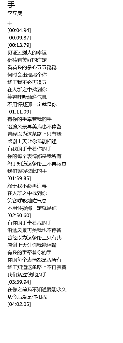 | [02:52.58] | yǒu nǐ de shǒu qiān zhe wǒ de shǒu |