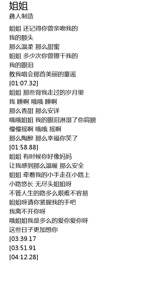 | [03:52.80][03:39.17] | 姐姐耶我爱你姐姐耶我爱你 |