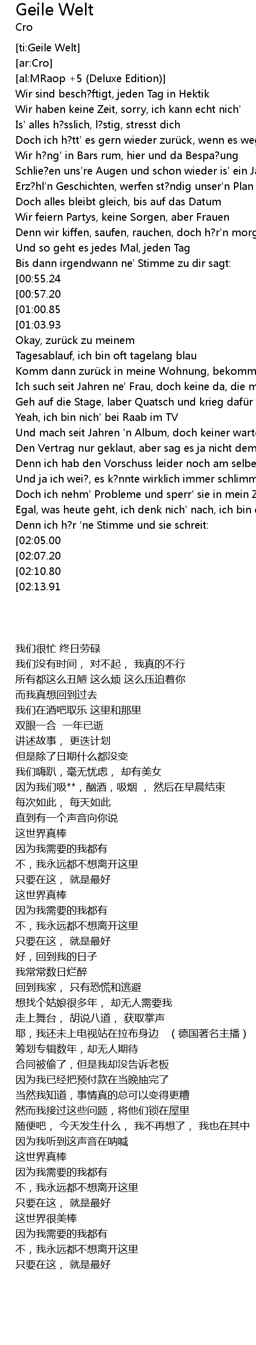| [02:19.00][02:05.00] | Diese Welt is' geil |