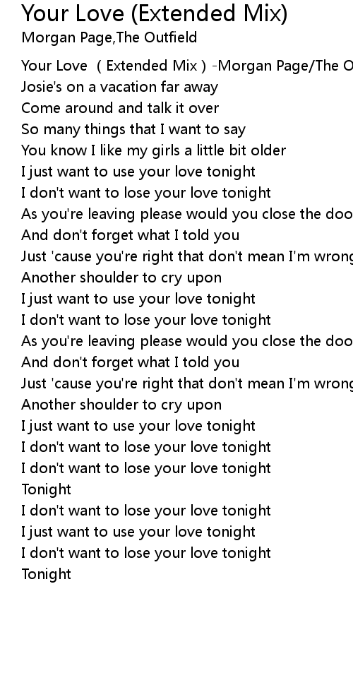 | [00:00.573] | Your Love Extended Mix Morgan Page The Outfield |
