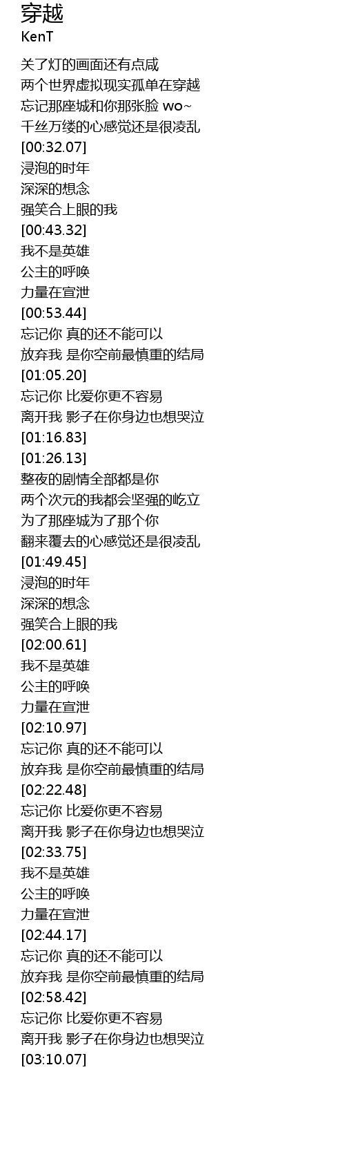 | [00:16.61] | 两个世界虚拟现实孤单在穿越 |