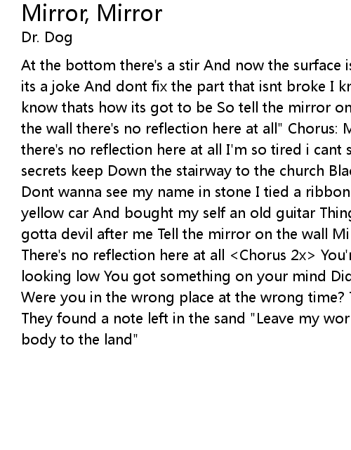 At the bottom there's a stir And now the surface is a blur Tell the truth like its a joke And dont fix the part that isnt broke I know im just a memory And i know thats how its got to be So tell the mirror on the wall "Mirror,Mirror on the wall there's no reflection here at all" Chorus: Mirror,Mirror on the wall there's no reflection here at all I'm so tired i cant sleep The secrets that my secrets keep Down the stairway to the church Blackbirds hanging in the lurch Dont wanna see my name in stone I tied a ribbon round a bone i took a ride in a yellow car And bought my self an old guitar Things aint what they used to be I gotta devil after me Tell the mirror on the wall Mirror mirror on the wall There's no reflection here at all <Chorus 2x> You're looking high, you're looking low You got something on your mind Did someone give you bad directions? Were you in the wrong place at the wrong time? They found a body in the river They found a note left in the sand "Leave my worries to the water and leave my body to the land" |