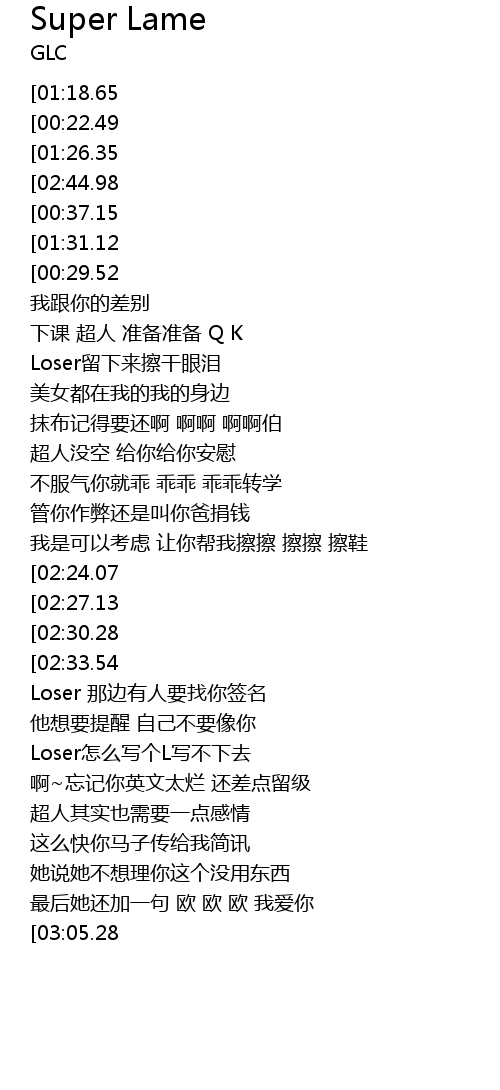 | [02:43.24][02:44.98][02:46.60][02:56.66][02:58.16][02:59.60] | year~我是superman |
