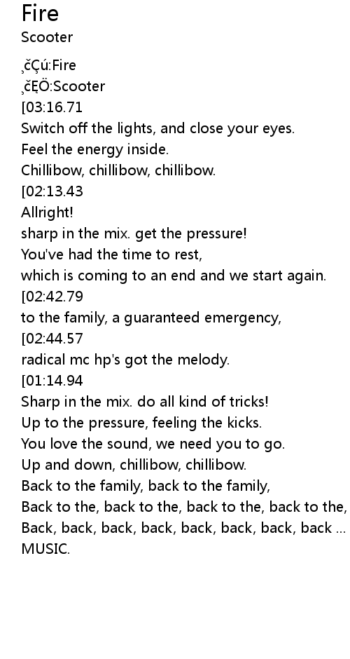 | [02:56.37][02:13.43][01:15.93][00:32.55][00:18.65] | Fire!!! |