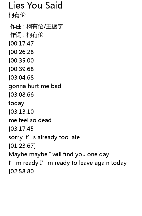 | [03:21.99][03:04.68][02:29.56][02:11.87][01:05.91][00:48.49] | Lies you said are gonna hurt me bad |