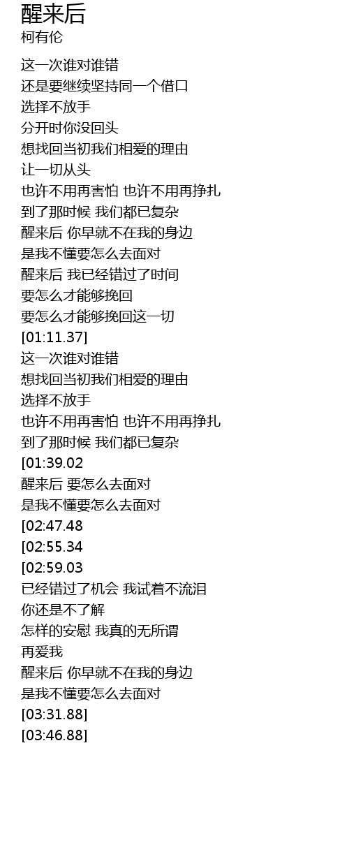 | [03:02.55][01:39.02] | 醒来后 你早就不在我的身边 |