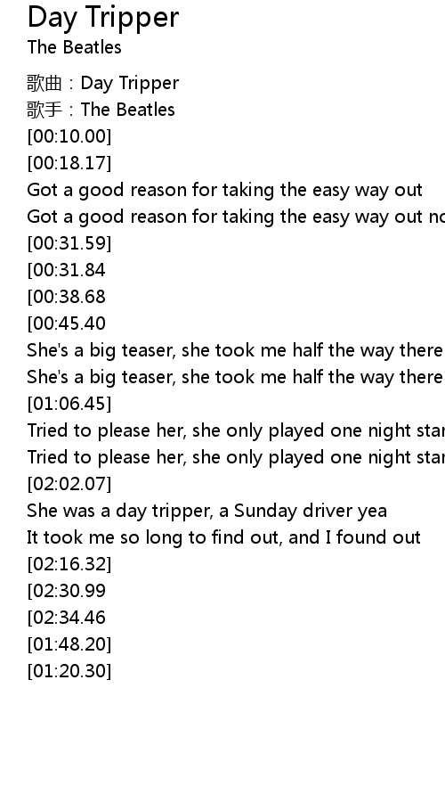 | [01:06.67][00:31.84] | She was a day tripper, a one way ticket yea |