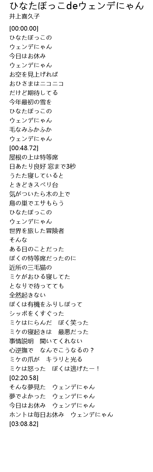 | [02:57.61] | ホントは毎日お休み ウェンデにゃん |