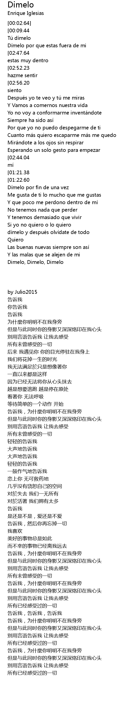 | [01:46.33][00:09.44][00:03.58] | Dímelo |