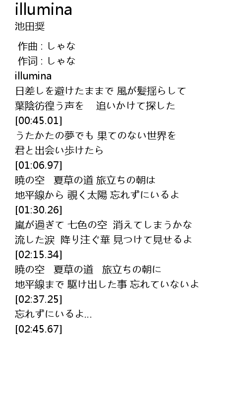 | [00:34.67] | 葉陰彷徨う声を 追いかけて探した |